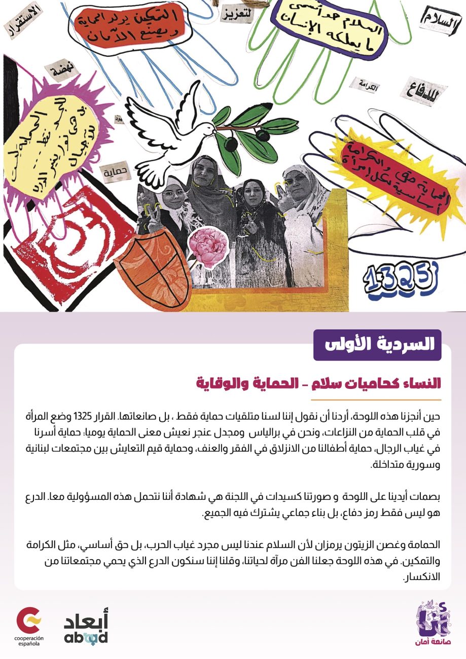 نفذ مشروع “أنا صانعة أمان” ضمن إطار قرار مجلس الأمن 1325 حول المرأة والسلام والأمن، بالشراكة بين منظمة أبعاد وبتمويل من الوكالة الإسبانية للتعاون الدولي من خلال مؤسسة FICDE، وبالتعاون المباشر مع 6 لجان نسائية مجتمعية من مختلف المناطق اللبنانية. يهدف المشروع إلى تعزيز مشاركة النساء في الوقاية من العنف وبناء السلام داخل مجتمعاتهن، من خلال منهجية تشاركية تُشرك النساء في جميع مراحل التخطيط والتنفيذ والإنتاج.